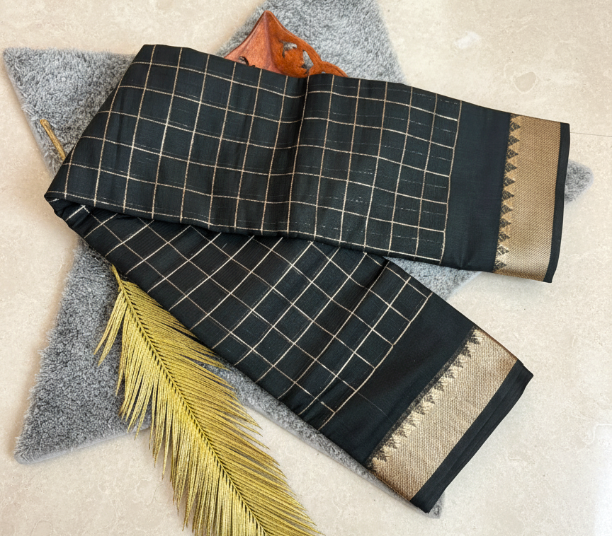 Black Mangalgiri saree in golden checks with golden border Originated from Andra Pradesh known for their fine cotton weaves and durability with the check pattern are the signature element.