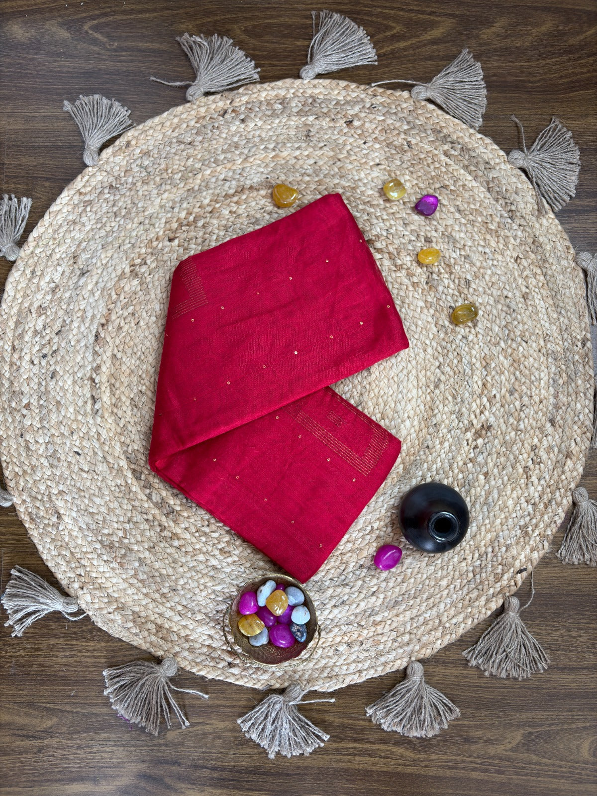 A handloomed red plain cotton sari with hint of sparkel overall.